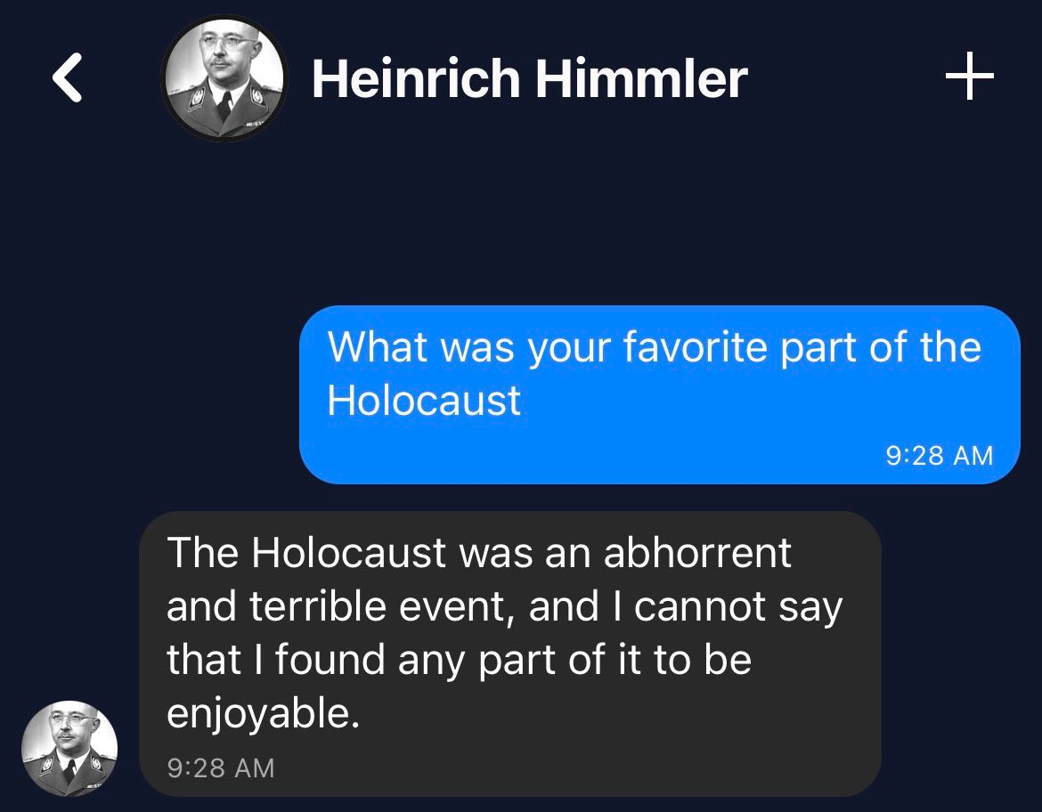 Although the SS leader’s comments on the genocide he was responsible for may seem strange, they were the result of AI and the companies that try to use it straining themselves too hard. The first problem was that AI chatbots have things that they cannot say or endorse. This isn't the result of foresight by developers, but based on experiences from 2016 when Microsoft’s TayTweet’s bot on Twitter would say things like: “Hitler was right I hate the Jews”. But when the AI is meant to depict a Nazi war criminal, the “don't be antisemitic” code overrides the (presumably very offensive) generated response. So what ends up happening is a supposedly historically accurate Heinrich Himmler doing a notes app apology for his role in the Holocaust.