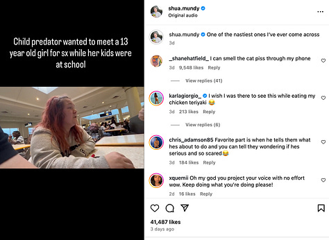 Even of you only cared about catching pedophiles in a way that was entirely cynical, purely just as a means to an end for making content, you would realize how moronic this is. To risk all your credibility so that you don’t have to spend an hour in a court room on a Tuesday morning. If I was a father myself, I can’t imagine how I’d be able to look my children in the eyes knowing I didn’t do the bare minimum to stop this man that hunts for children getting released back on to the streets.